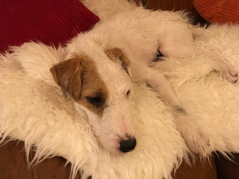 Today I discovered that sweet potato wrapped in fish skins is my other favourite treat, that I like them so much I don’t even toss them at Aubrey, that my superpower is invisibility because I disappear every time I lie on one of our white shag rugs on the sofa, that Human says my power of invisibility makes me like the Cheshire Cat, that this suits me very well as I am rather fascinated by cats, that I am still too fascinated by cats for Poly Styrene the kitty’s taste but I’m working on it, that it’s always a good time for zoomies, that the television pause function is essential for zoomies breaks, that Human has to use the pause function a lot.