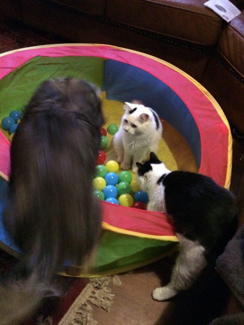 It might be as simple as showing someone an easier way to do something at work or home, or teaching them a new word, or a new fact, or a new trick (yes, don’t forget the other-than-human animal people too!). It could even be a new game (like Jeff teaching the kitties, Lora Logic and Poly Styrene, the fun of playing with balls in the ball pit!). It really could be any little thing that will brighten someone’s day. Teaching someone something new and simple is really fun, it’s really special, and it’s really kind.